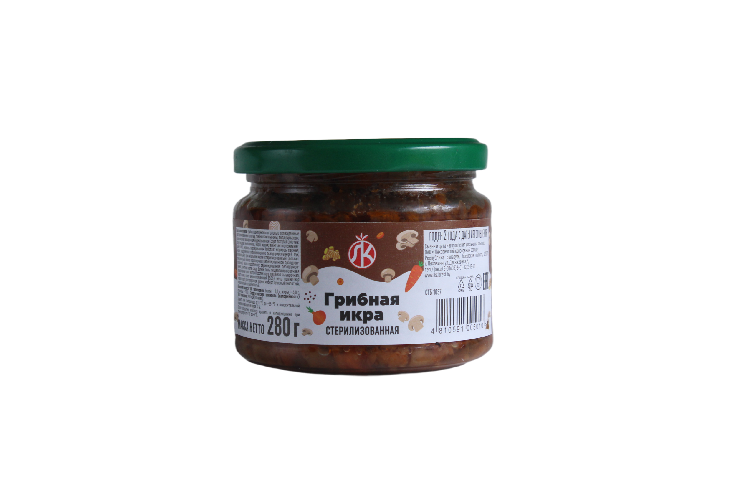 Грибная икра (шампиньоны) стерилизованная (280 г) — это готовая закуска из измельченных грибов, выпускаемая ведущими белорусскими предприятиями, включая ОАО «Ляховичский консервный завод».