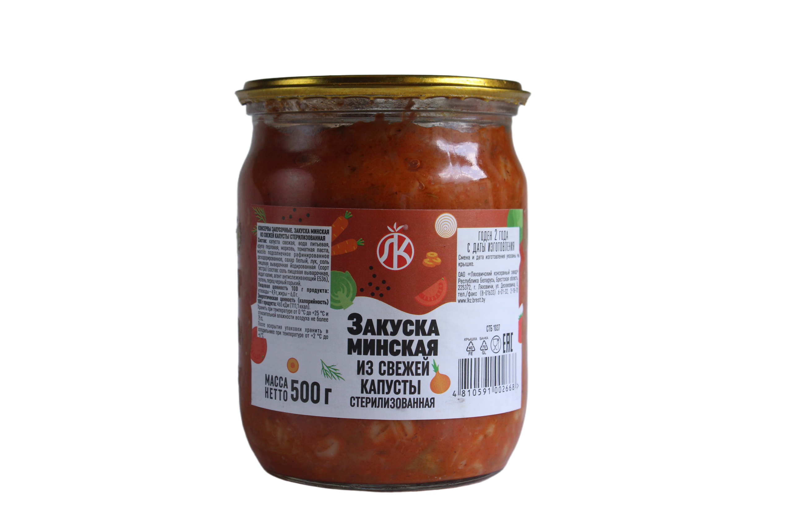 «Закуска Минская» — это сытные овощные консервы, которые отличаются от обычных салатов наличием крупы и томатного соуса. Основной производитель — Ляховичский консервный завод.