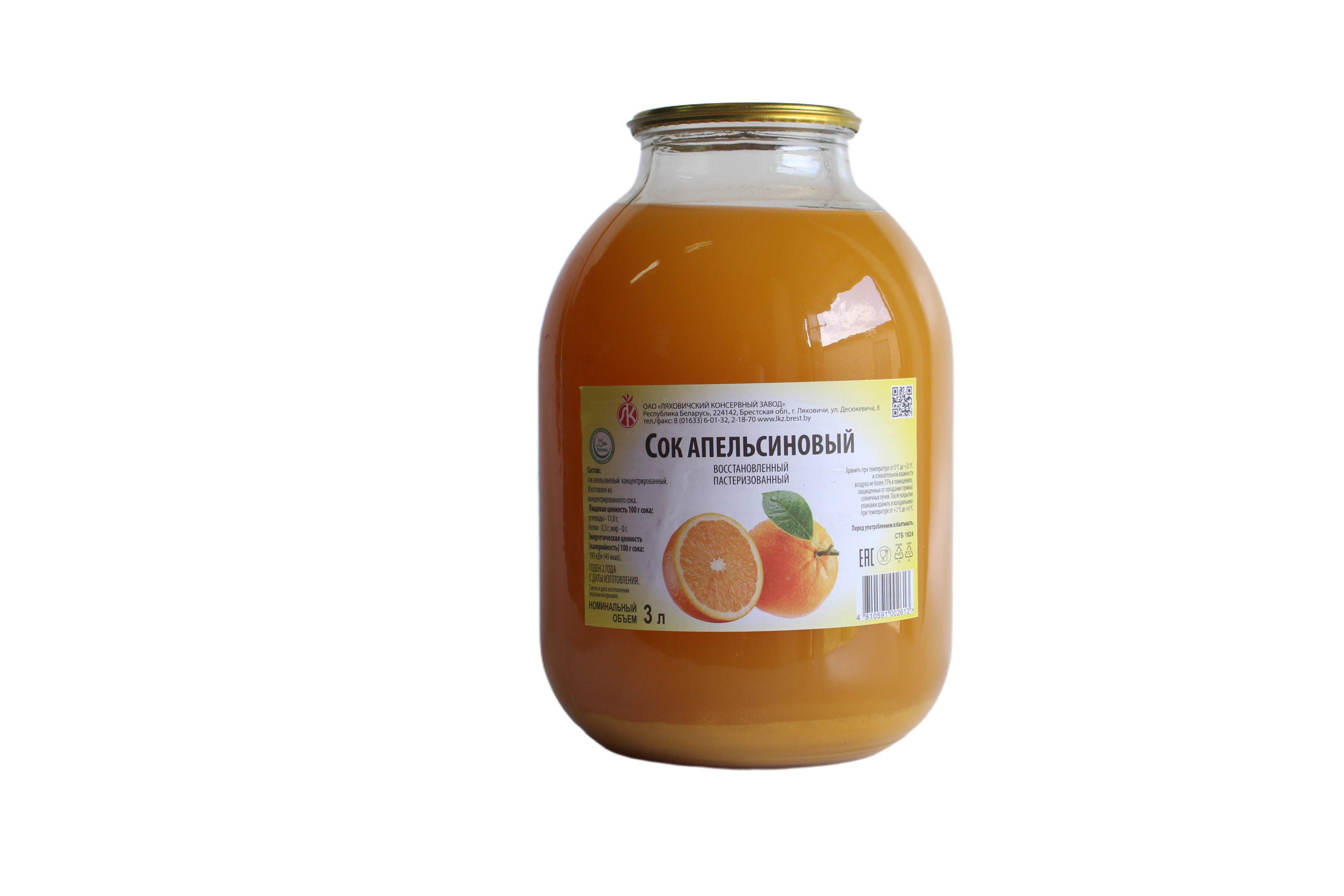 Сок апельсиновый восстановленный стерилизованный (3000 г) — это натуральный напиток от ОАО «Ляховичский консервный завод» (Беларусь), произведенный из концентрированного сока и питьевой воды. Продукт поставляется в крупной стеклянной таре объемом 3 литра, что удобно для больших семей и праздничных мероприятий.