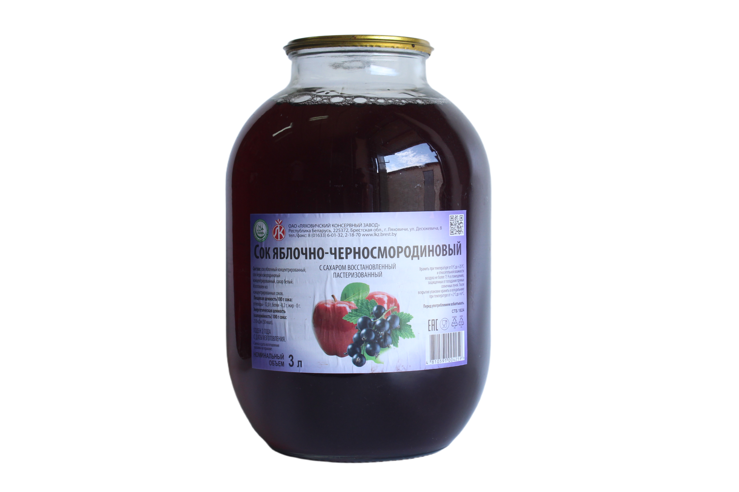 Сок яблочно-черносмородиновый с сахаром восстановленный пастеризованный (3000 г) — это популярный витаминный напиток от ОАО «Ляховичский консервный завод» (Беларусь). Продукт отличается насыщенным ягодным вкусом и характерным темно-бордовым цветом за счет добавления черной смородины.